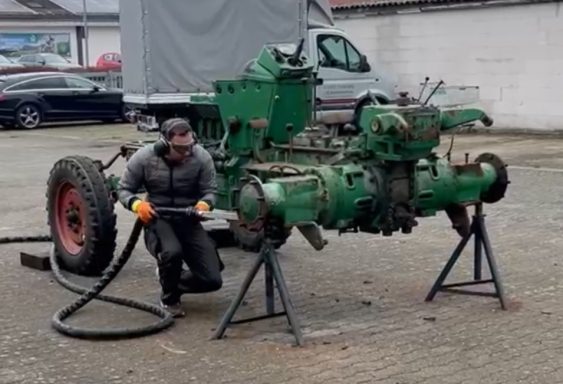 Als Vorbereitung für einen Neuanstrich des Deutz Traktors sollte zunächst altes Fett und Öl durch Trockeneis beseitigt werden. Auch die rostigen Stellen wurden dabei deutlich beseitigt. Ebenso ließ sich die Deckfarbe weitestgehend abstrahlen.
