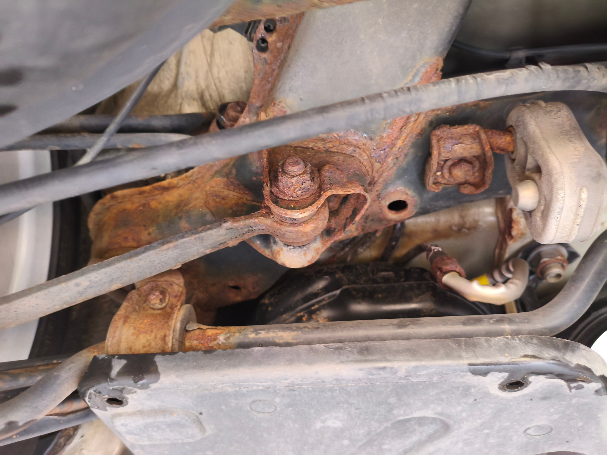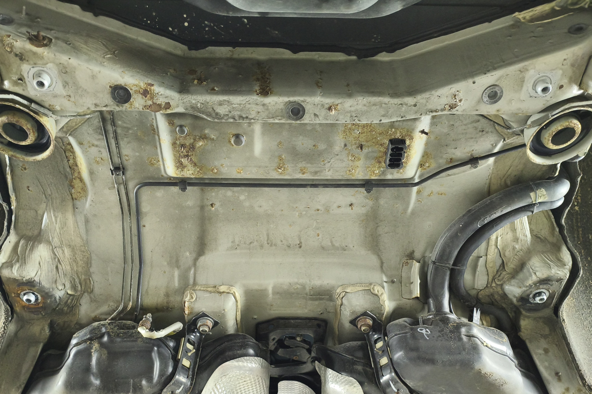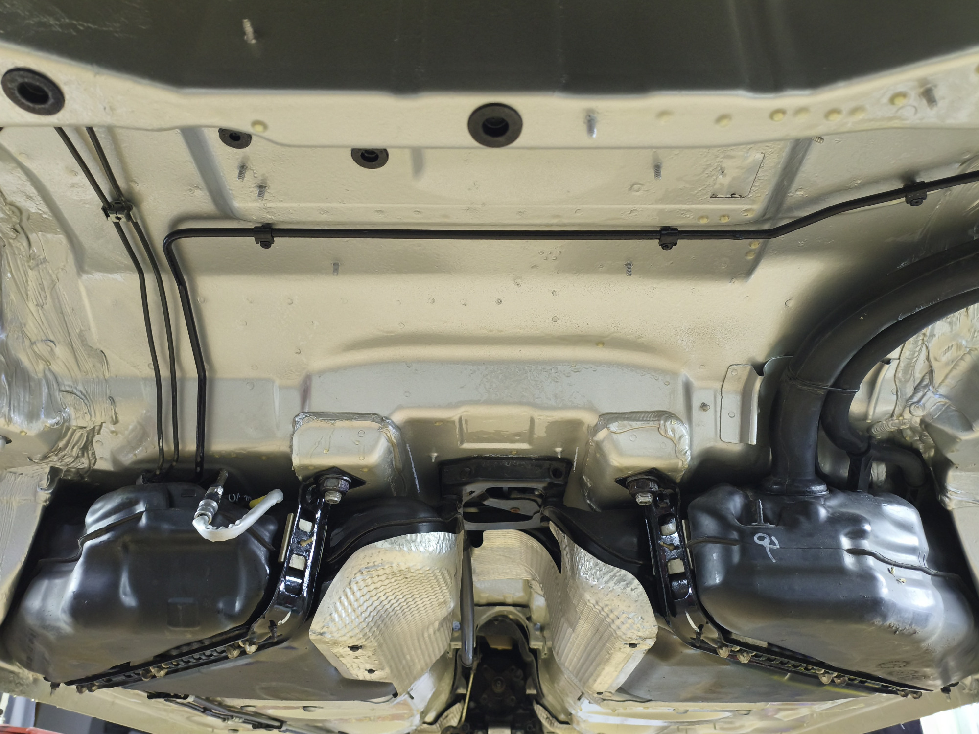 Der Unterboden war stark vom Rost befallen. Nach der Demontage aller sich am Unterboden befindlichen Teile und Baugruppen wurde der Unterboden trockeneisgestrahlt. Danach kam der Neuaufbau mit entsprechendem Rostschutz, Lack und transparentem Unterbodenwachs.